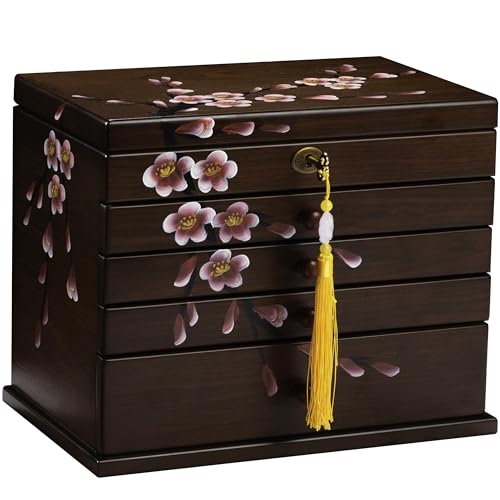 Xloverise Vintage hand-drawn Jewelry Box Wood, 5-Layer Wooden Jewelry Organizer Boxes with 4 Drawers, Multi-functional Jewelry Storage Case for Wowen with lock Christmas Gifts