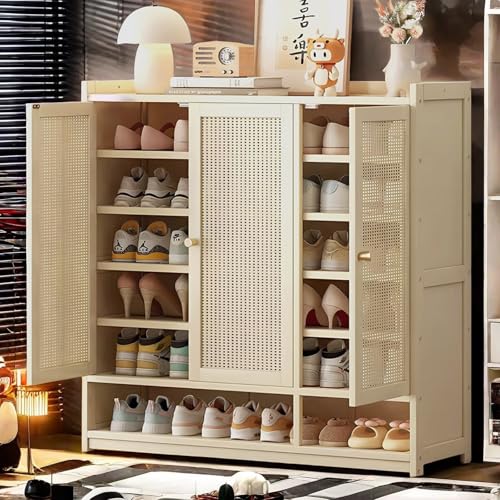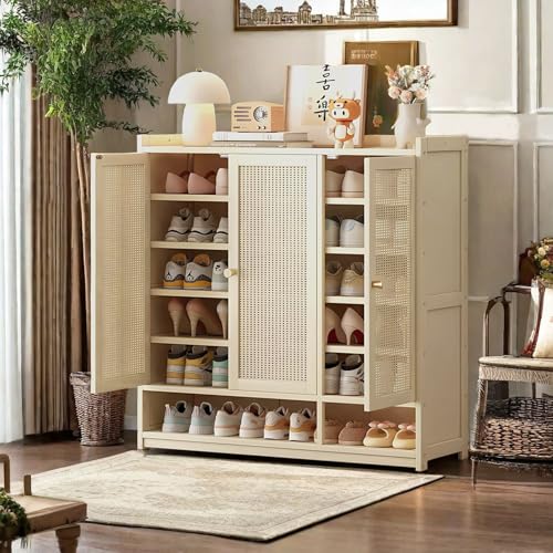 Large capacity, perfect storage — The top area is ideal for your preferred decorations. The shoe cabinet with door provides an enclosed space to keep your shoes clean whilst no piled-up shoes or messy hallway anymore! The top of our shoe cabinet is raised by 8 inches to effectively prevent items from falling. The cabinet door adopts a double-open folding door, which is easy to take. Cubic storage, making full use of each inch of space